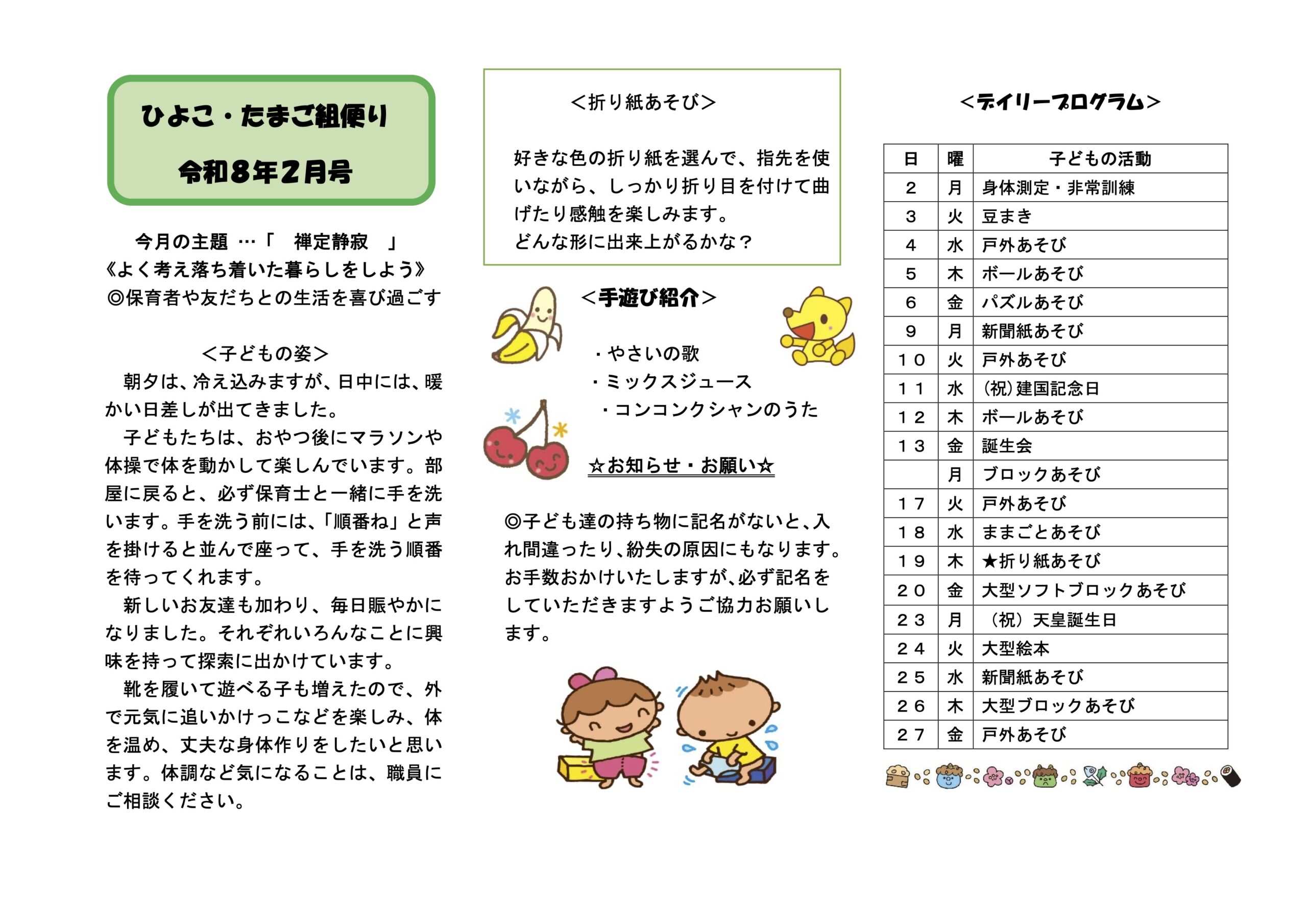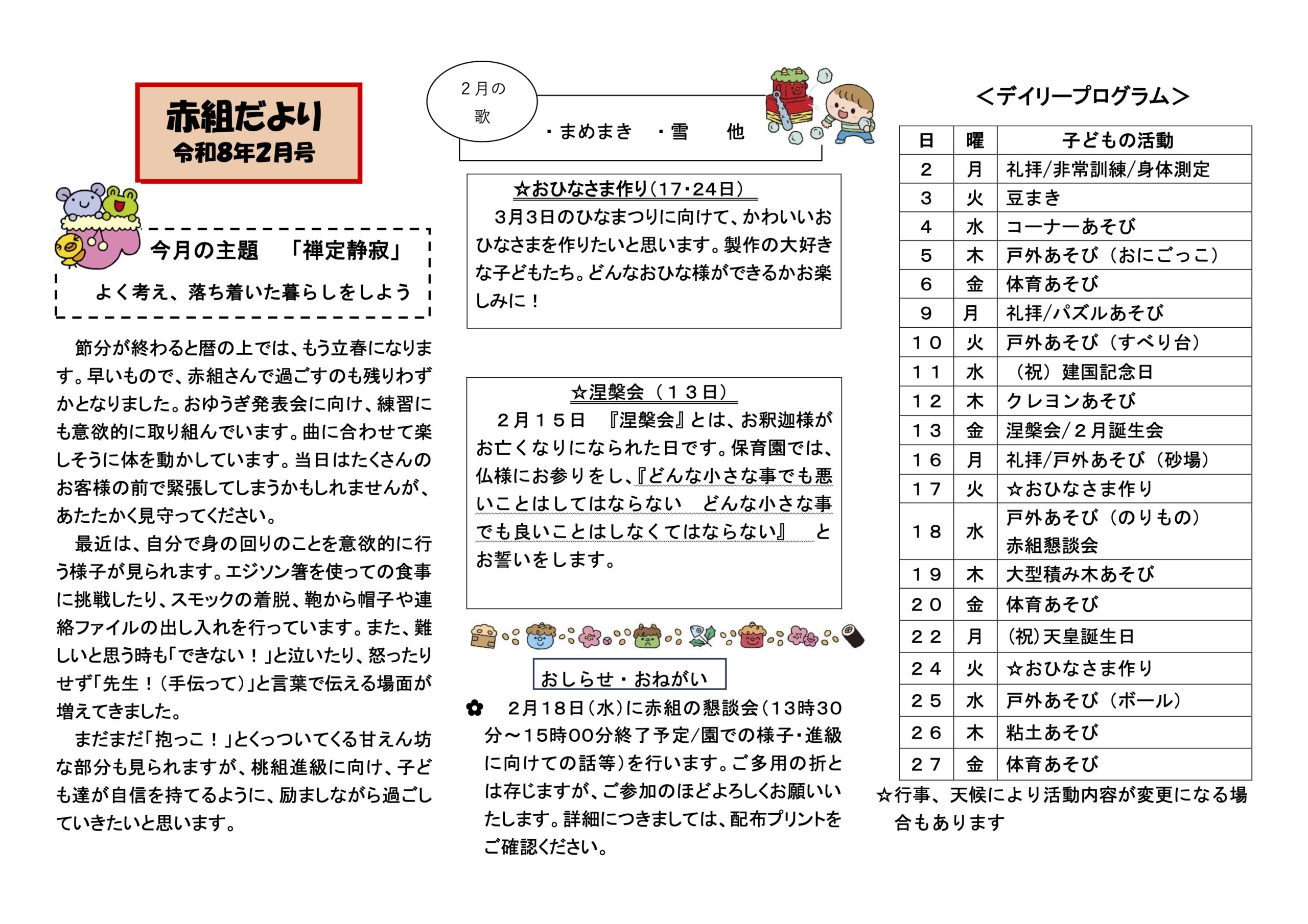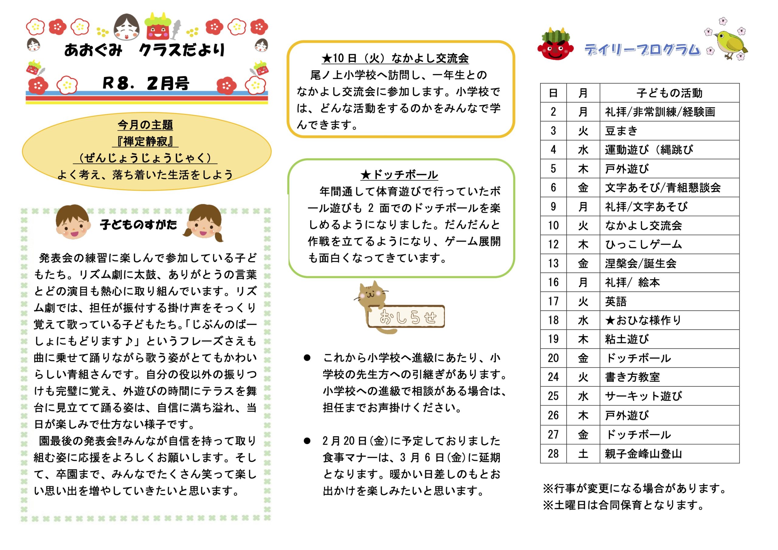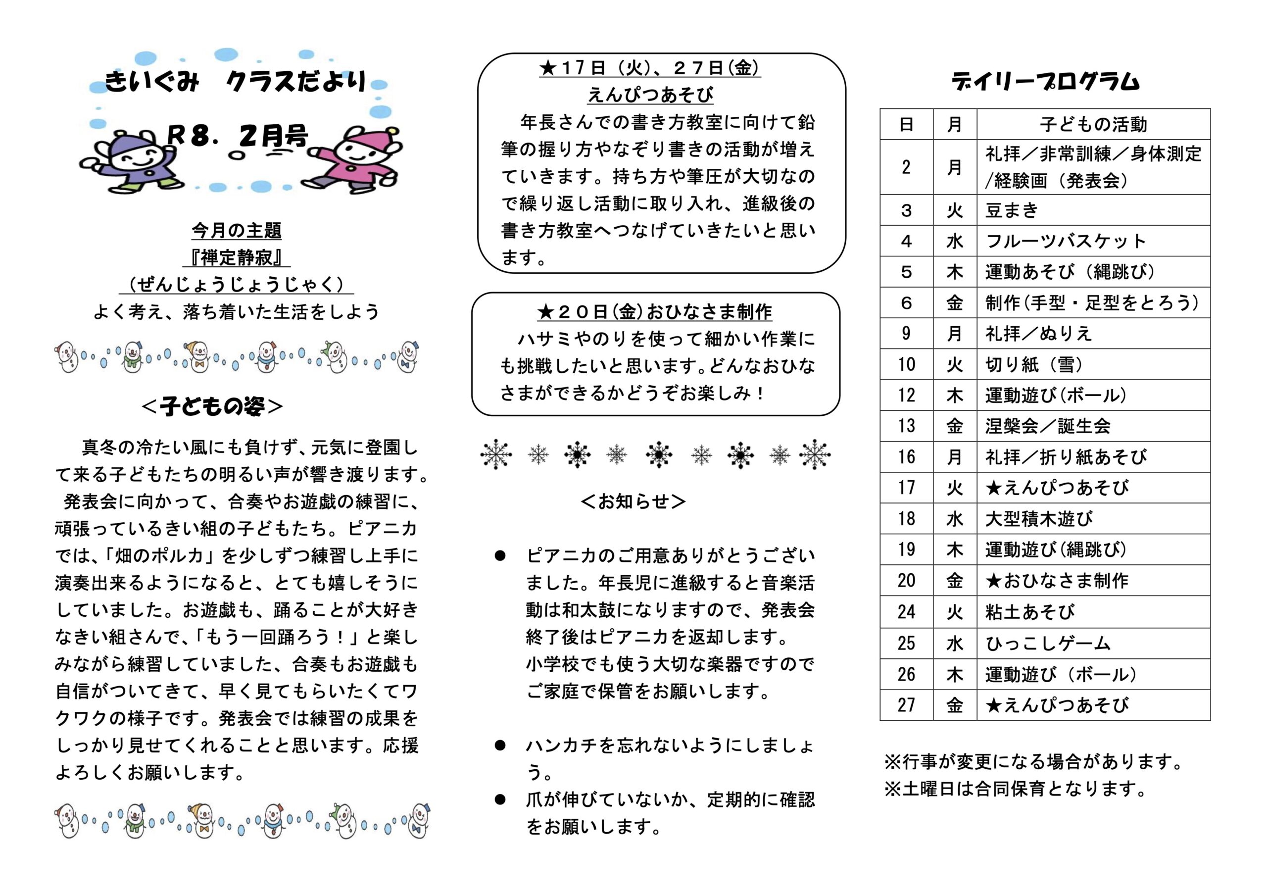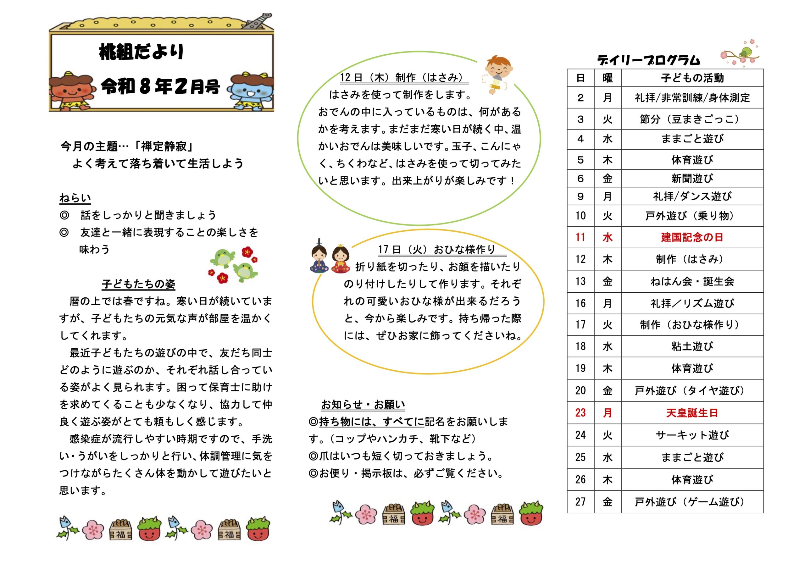 令和8年2月 クラスだよりとなります。